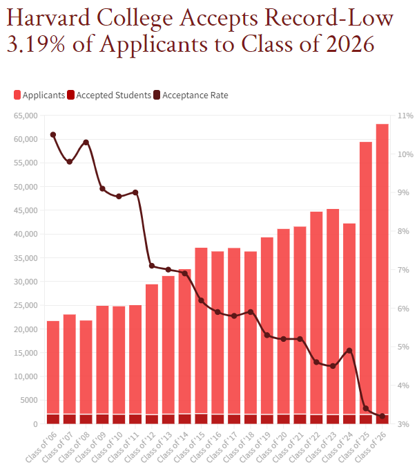 哈佛大学录的取率连年走低,今年从61220名申请者中录取了1954人,录取率低至3.19% ,刷新了去年的最低纪录3.42%。