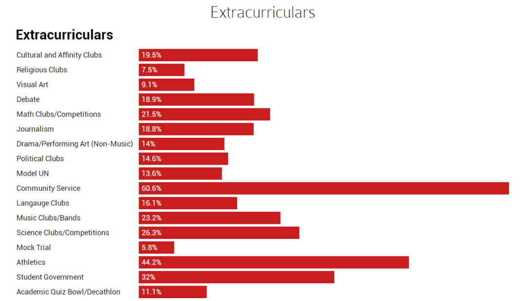 最受欢迎的高中课外活动包括社区服务(60.6%),运动(44.2%),想拿到哈佛offer的同学一定要努力提升自己的背景。