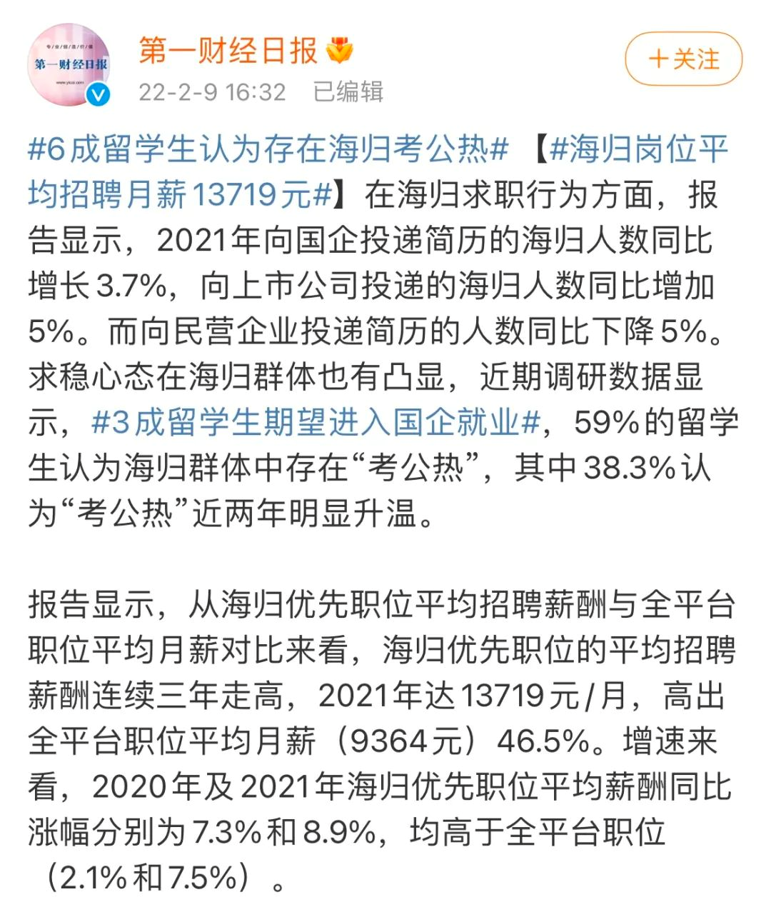 前段时间, 《2021中国海归就业调查报告》 正式发布。该报告分析了2021年海归群体的就业形势,一经发布,便引发了网友们的热烈关注和讨论。