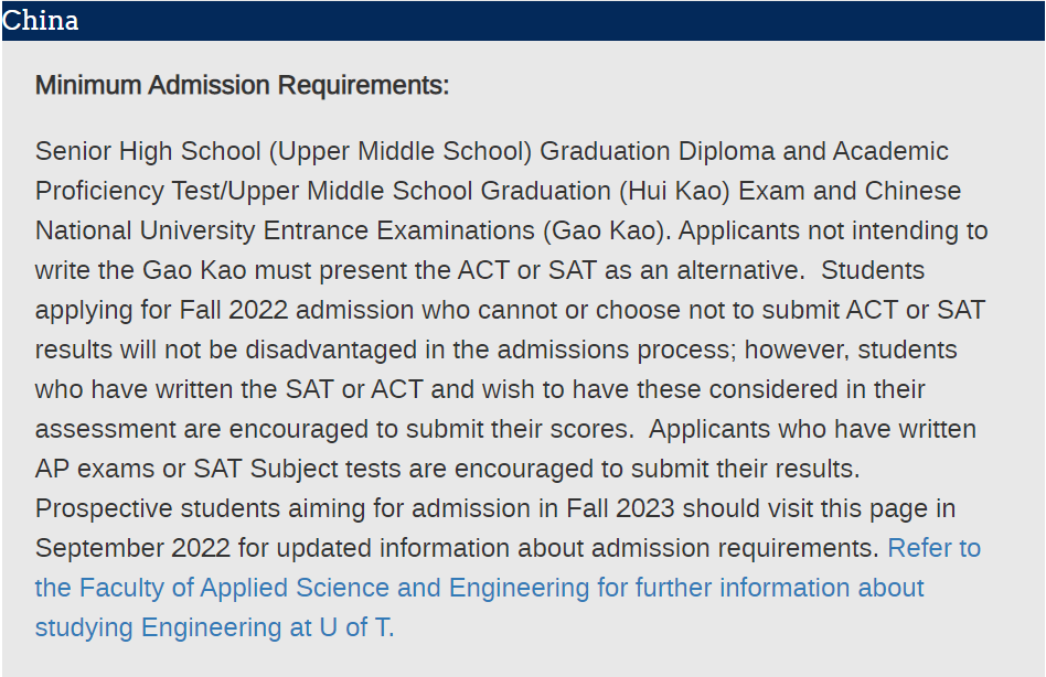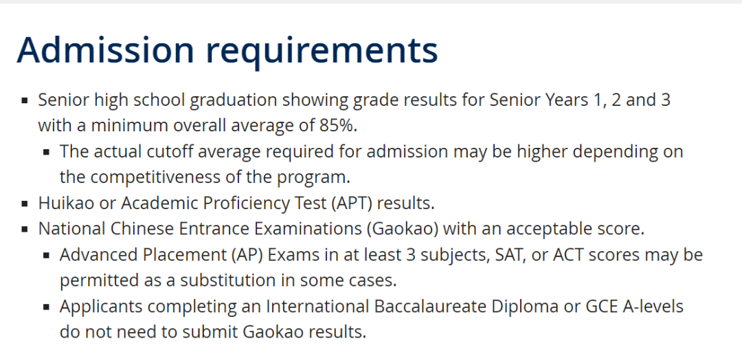 对于高考成绩有Acceptable score的要求,不是很明说,但是既然对于整个高中的GPA要求是85以上,我们基本也可以认为,最好达到省一本线,这样才比较有竞争力。