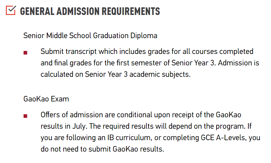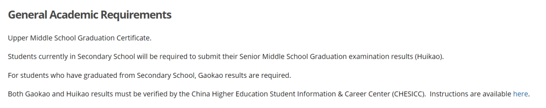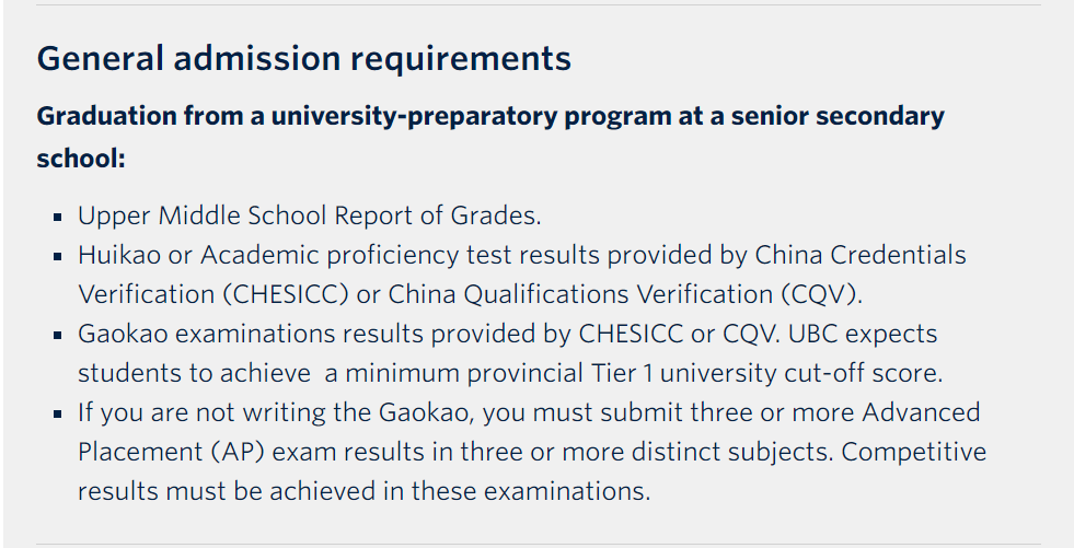 UBC大学要求普高申请人必须提供会考通过证明和高考成绩,且需要完成学信网认证。 UBC明确指出,高考成绩必须在一本线上。 如果没有参加高考,UBC要求申请人需要提供至少三门不同课程的AP成绩。