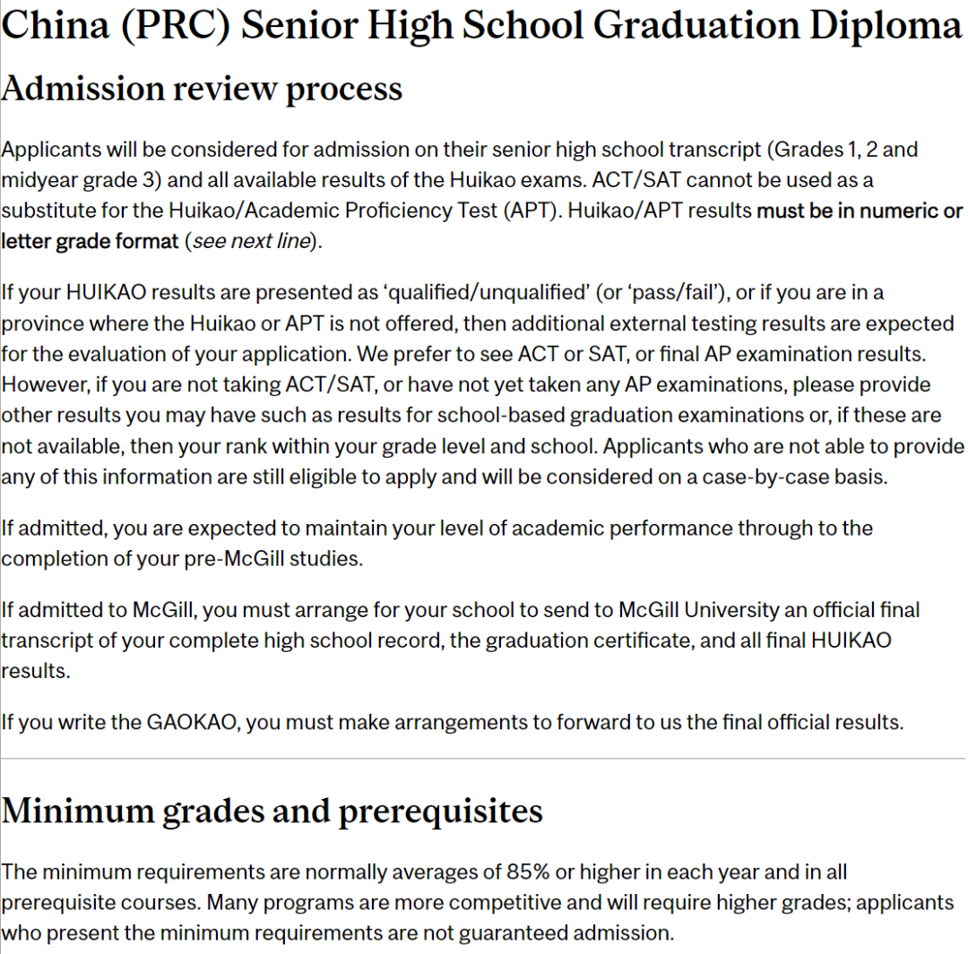 中国普高申请人在申请麦吉尔大学时必须提供: 平时成绩、会考成绩以及高考成绩。