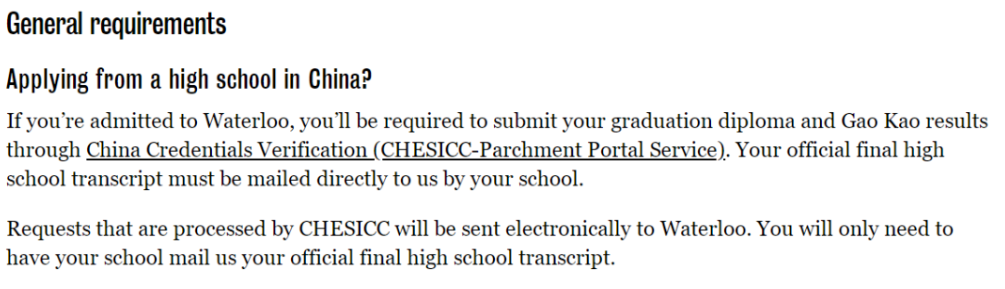 申请滑铁卢大学,需要提供学信网认证的高考成绩,以及在校成绩。 如果不参加高考,需要提供相符合的标化成绩取代,比如SAT和ACT。