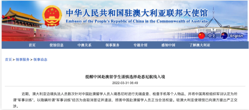 也有另外一名中国留学生在入境悉尼国际机场时,