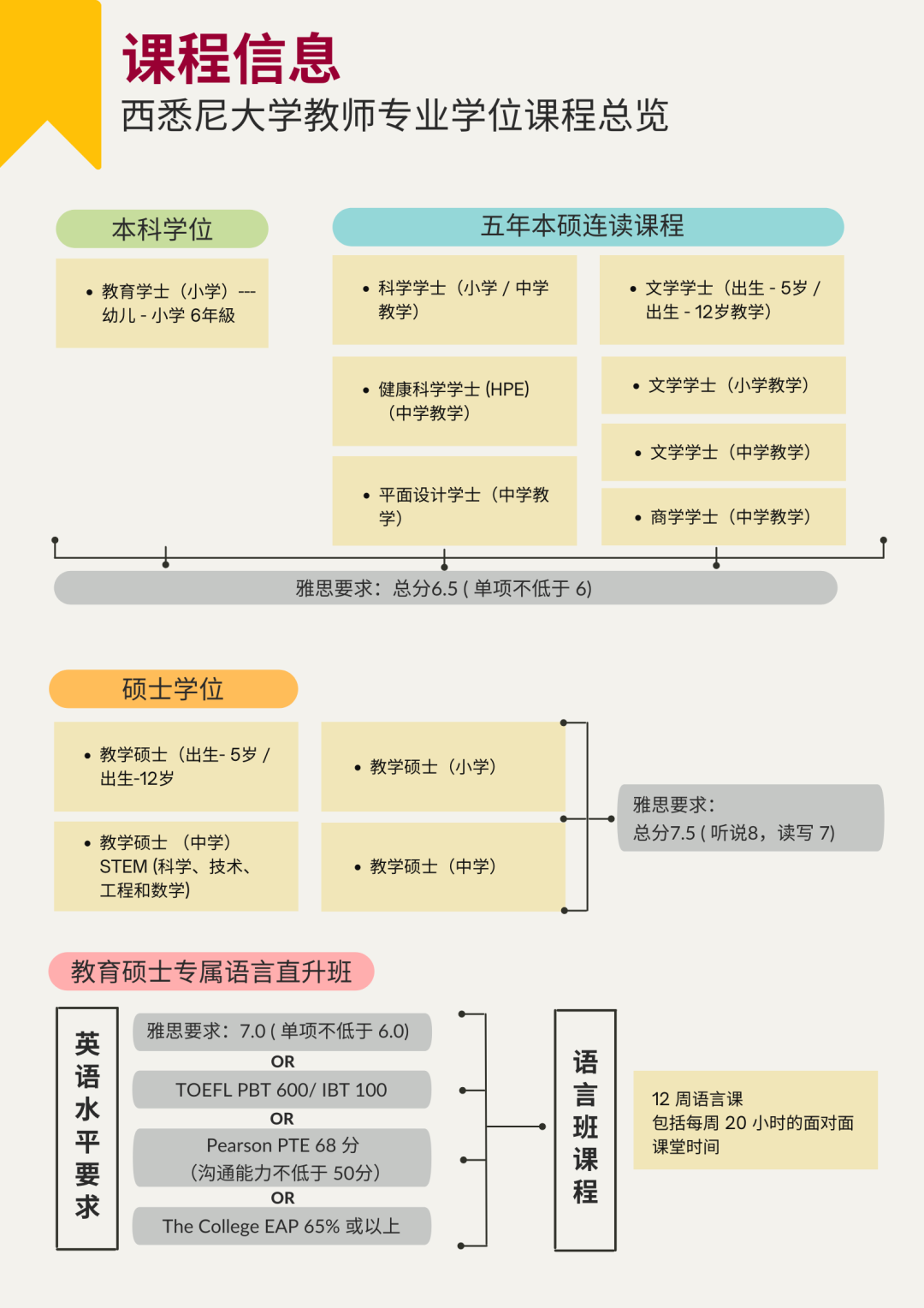 西悉尼大学教育学院提供多种由幼儿到中小学的课程,包括本科学位、五年本硕连读学位、硕士学位、以及教育硕士专属语言直升班、以适合不同需求和阶段的学生,接下来将一一阐述各学位的课程信息。