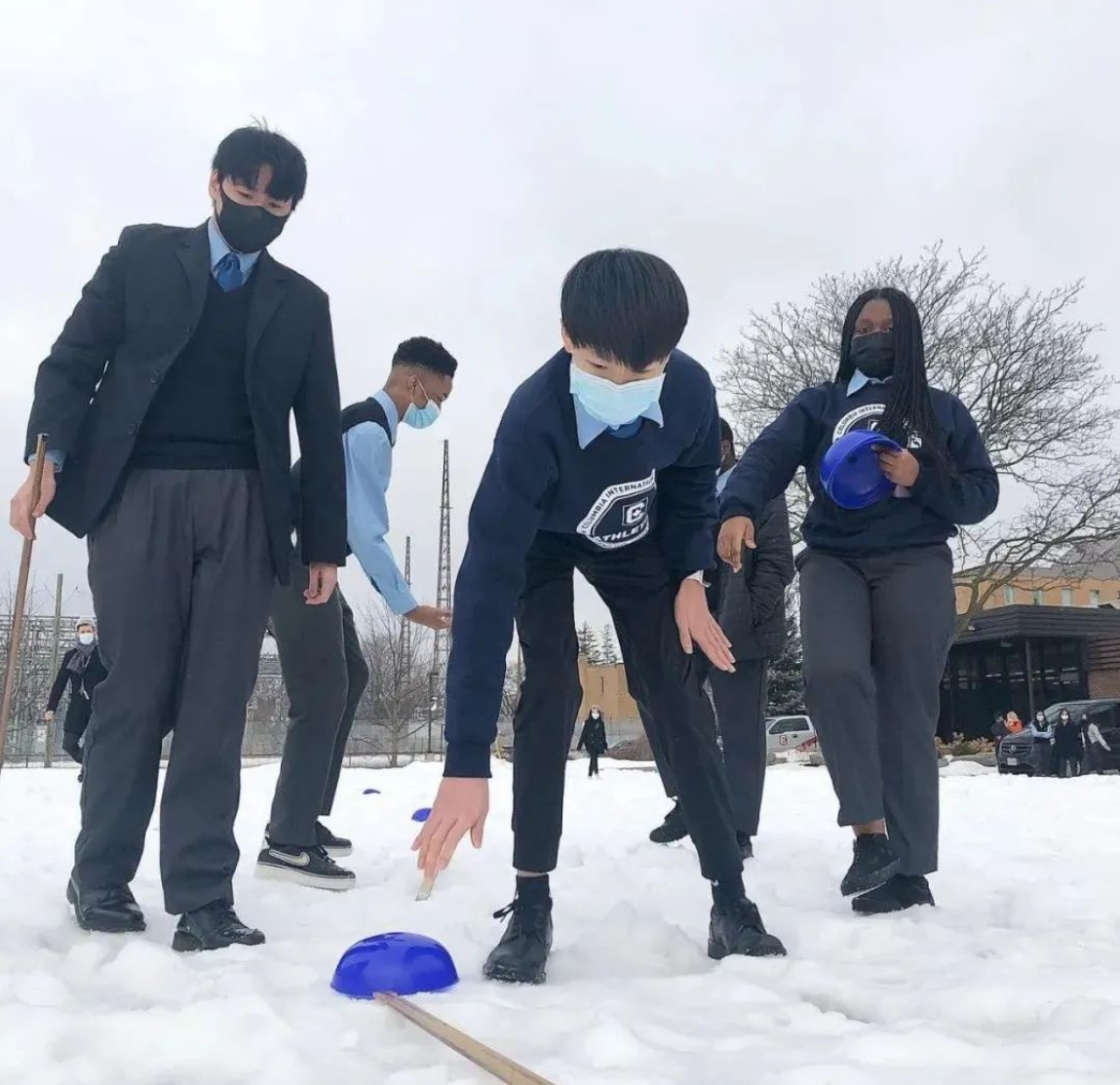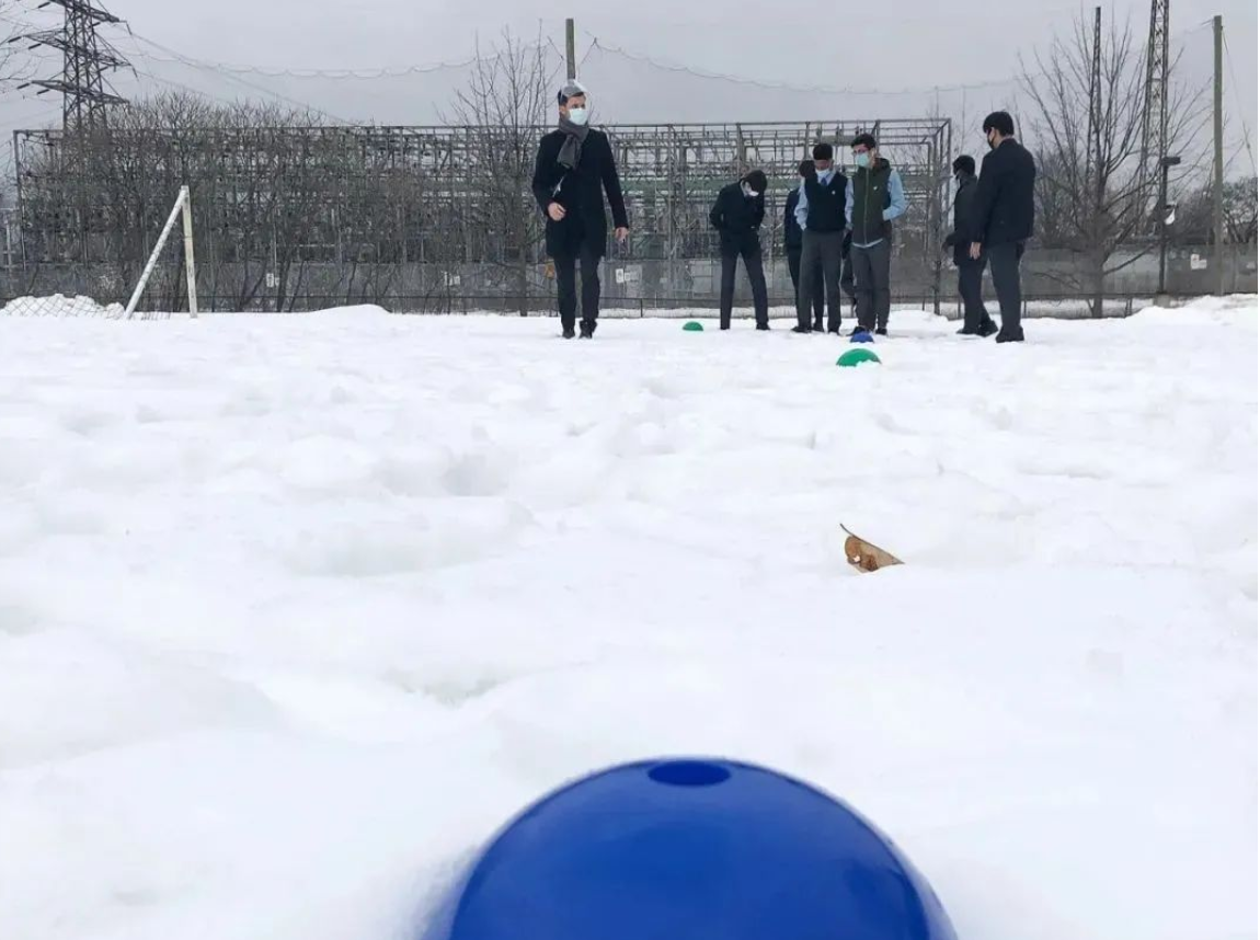 首先,他们在雪地上摆放了距离标记。然后,一组学生用雪球扔出抛物线,另一组学生用手机录下雪球飞行的整个过程。