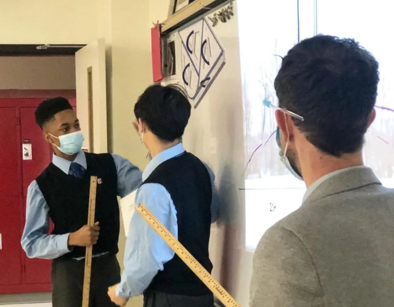 学生上台用尺进行测量。根据自己身高及雪地上的标记,他们估算雪球飞行距离与顶点高度等参数。他们利用所有数据,成功创建了有顶点的二次方程。