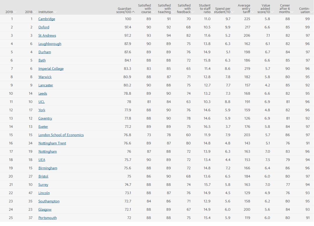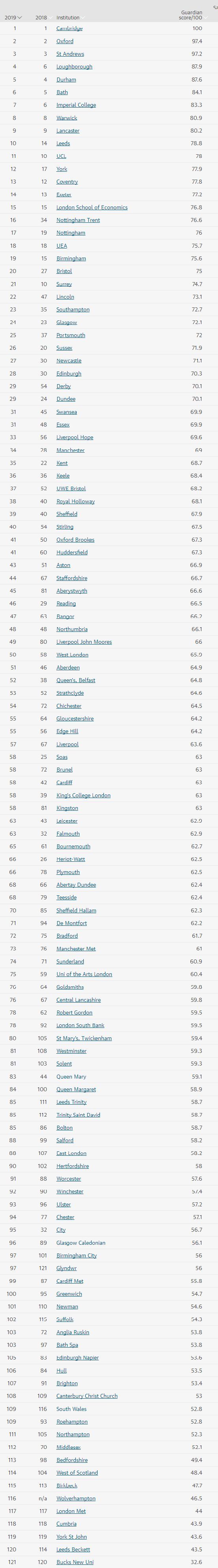 除了看 QS 世界排名,泰晤士报排名,也可以参考英国《卫报》 2019 年大学排行榜( University league tables 2019 ), 121 所英国大学上榜!今年的排名情况如何?有哪些变化呢?