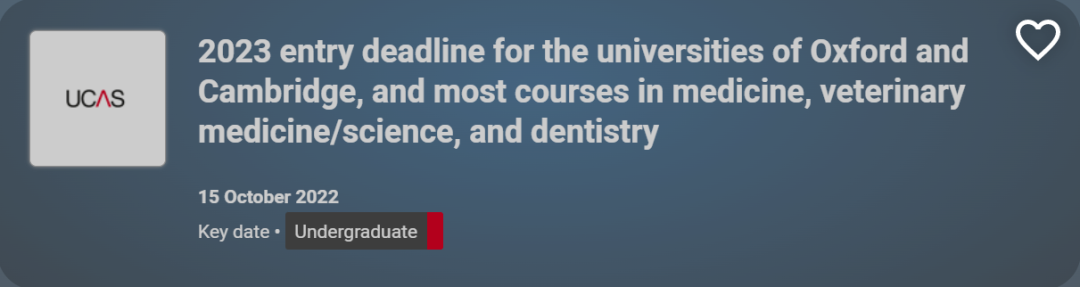 牛津、剑桥大学的所有专业,以及大部分的医学、兽医、牙医等专业截止申请 ,这些申请需要在10月15日18:00(英国时间)前提交到UCAS。