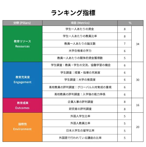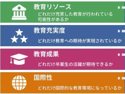 日本版排名指数由“教育资源”、“教育充实度”、“教育成果”、“国际化”四个领域组成。具体比例如下:教育资源→34%教育充实度→30%教育成就→16%国际性→20%
