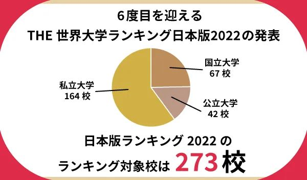 2022年日本版排名中,273所大学上榜。在综合排名中,东北大学排名第一,此次是东北大学连续3年获得日本国内第一。其次是东京大学(去年排名第 3),上升了一位,大阪大学(去年排名第 5),排名相同,上升了两位。东京工业大学(去年第 2 名),其次是第 5 名的京都大学(去年第 4 名)和第 6 名的北海道大学(去年第 6 名)。