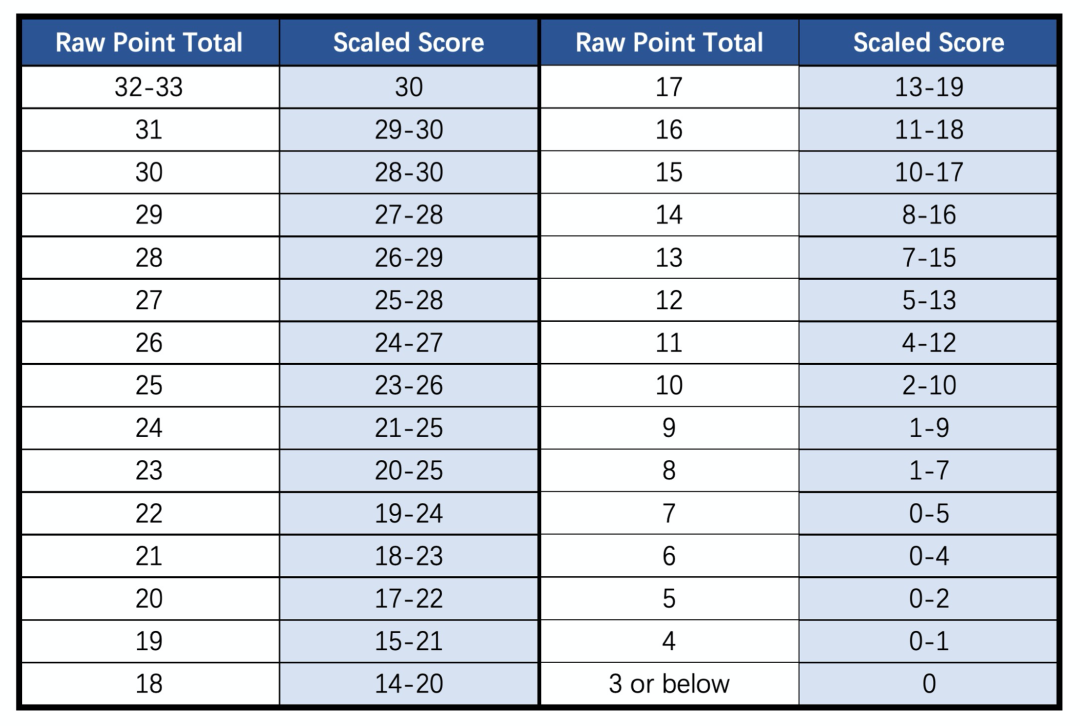 3篇文章一般总计初始分数33分,根据考生的初始得分,按照正态分布算最终分数。可以参看下面的分数换算表。但一般来说,三篇文章丢2个初始分数,可以得满分,多错一个,减1分。初始分数总共丢6分,基本可以拿到26分,平均一篇文章丢2分。这么来看,想拿到阅读高分,也并不是很容易。