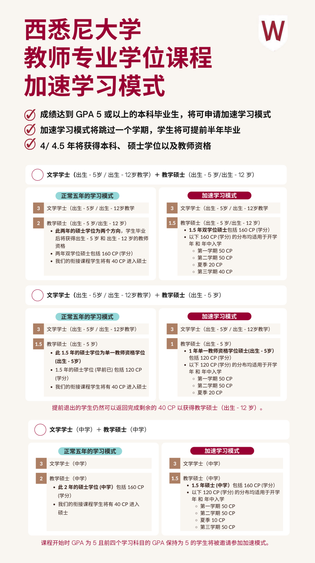 西悉尼大学教师专业学位课程提供加速学习模式,同学可以提前半年毕业,并在 4/ 4.5 年将获得本科+硕士学位以及教师资格,详情请参阅下图!