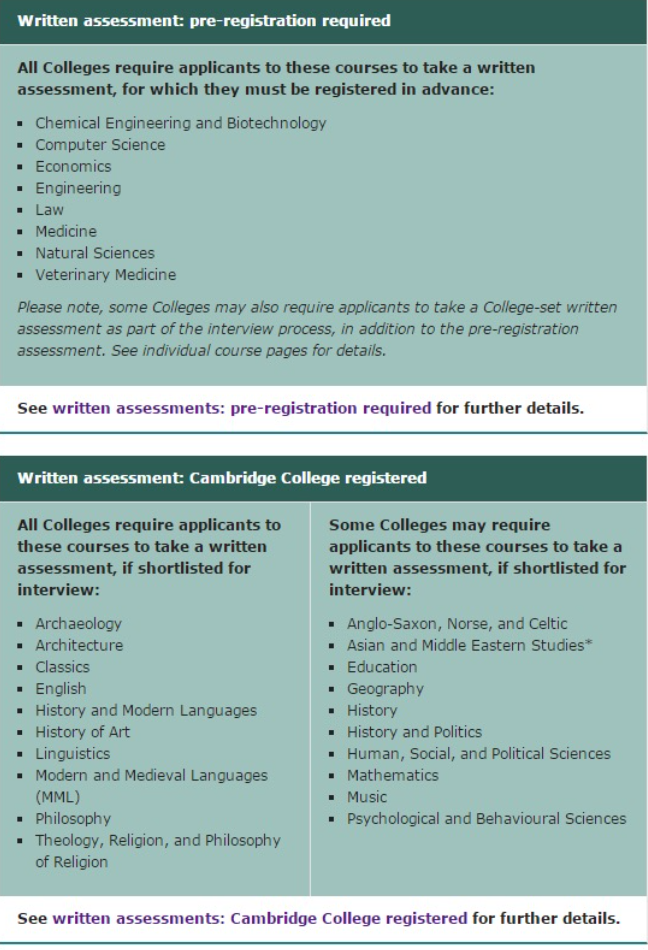 剑桥入学考试 Written assessment 分为 pre-registration require 和 Cambrige College registere。 8个专业需要参加常规的入学能力考试pre-registration require,10个专业有Cambrige College registere测试,10个专业部分学院有Cambrige College registere测试。