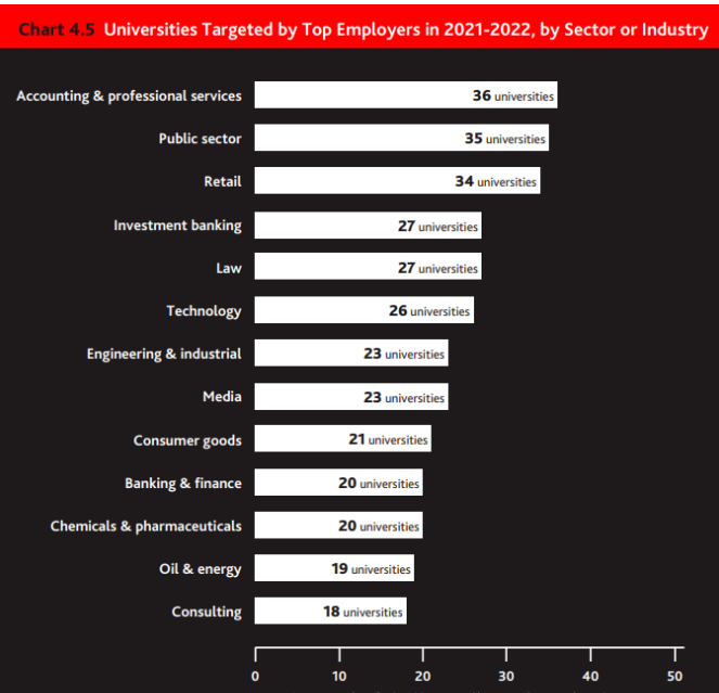 其中会计和专业服务公司、公共部门、零售商、投行和律师事务所是最主要的招聘方,他们会去尽可能多的大学展开招聘。