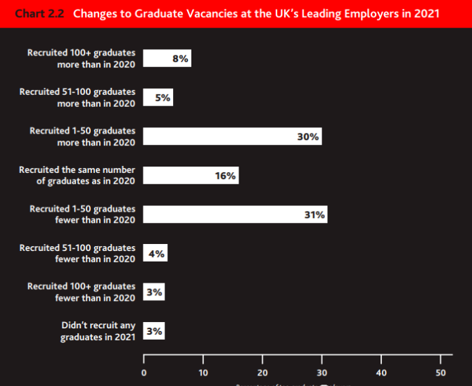 与2020年的招聘相比,到2021年招聘季结束时,2021年 43% 的顶级雇主增加了招聘的毕业生数量,其中 8% 的雇主招聘超 100人 。