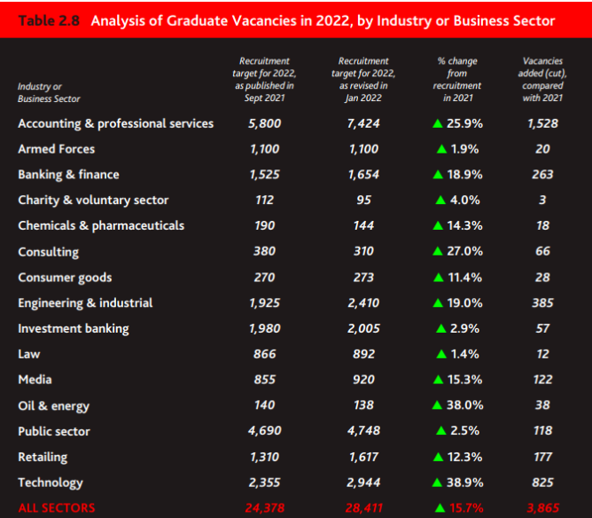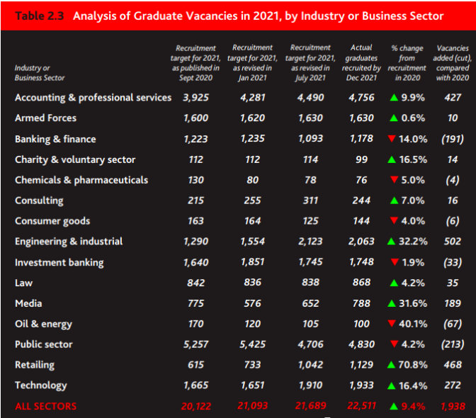 总的来说,英国知名雇主在2022年预计将招聘28411名毕业生,比2011年多3865个岗位。