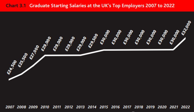 2007年毕业生薪资中位数只有24,500英镑,在2010年之前,英国顶尖雇主给毕业生的薪资逐年上升,但在全球金融危机结束后的十年里基本没有变化,只在2014年和2015年有些许上涨。