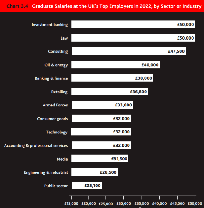 从就业企业薪资来看,2021年提供薪酬最丰厚的行业是投资银行、律师事务,都是薪资最高5W起,接着是咨询服务、石油和能源公司,以及银行与金融,年薪中位数依次为4.75万英镑、4.0万英镑、3.8万英镑。