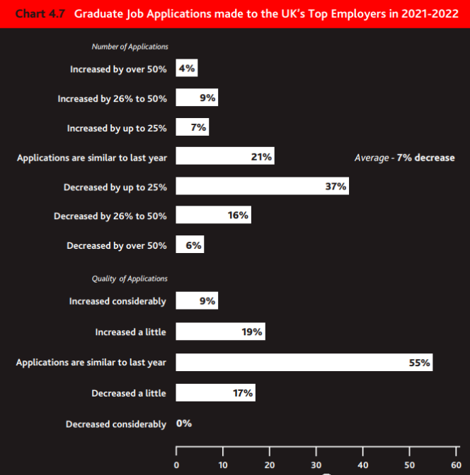 从统计可知,今年关键行业的岗位求职申请大幅下降,除了工程工业行业增加了10%的申请,以及会计和专业服务行业增加了仅仅1%,其他9个关键行业大多收到了比去年更少的实习生应聘申请。