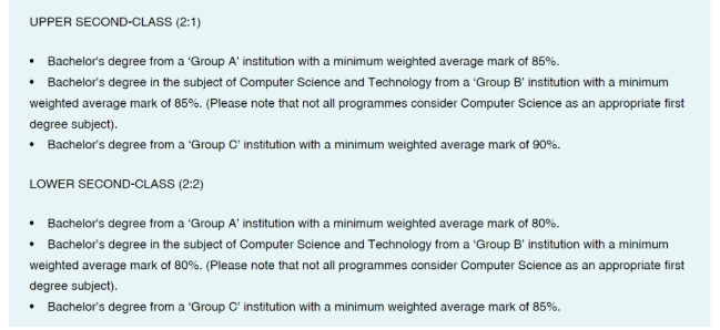 B组学生:本科计算机专业的学生提交的成绩最低加权平均分不得低于85%。非计算机学生不得低于90%(参考C组学生)。且需要注意不是所有专业都会将计算机专业的学生视同这个标准,如果你想申请这些不认同的专业同样分数要求参考C组不低于90%
