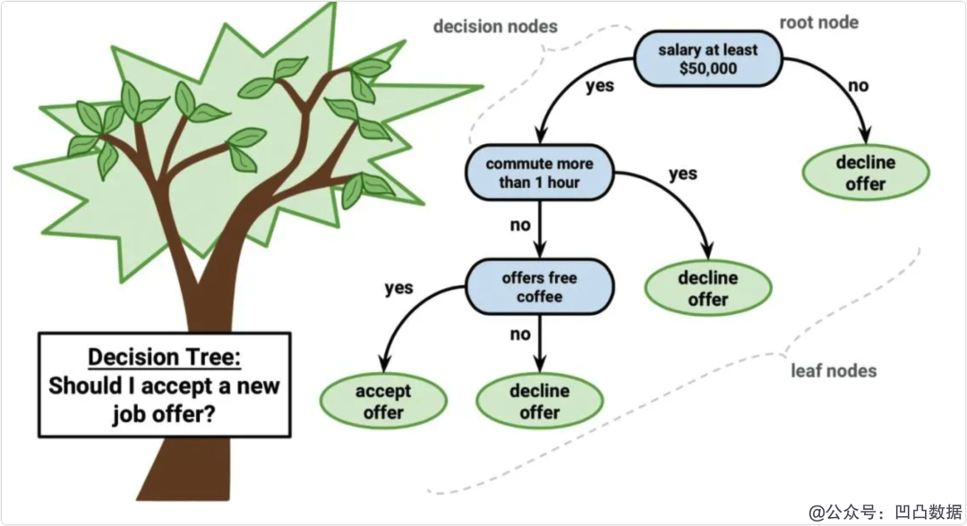 树的叶节点包含用于进行预测的输出变量(y)。预测是通过遍历树进行的,当达到某一叶节点时停止,并输出该叶节点的类值。