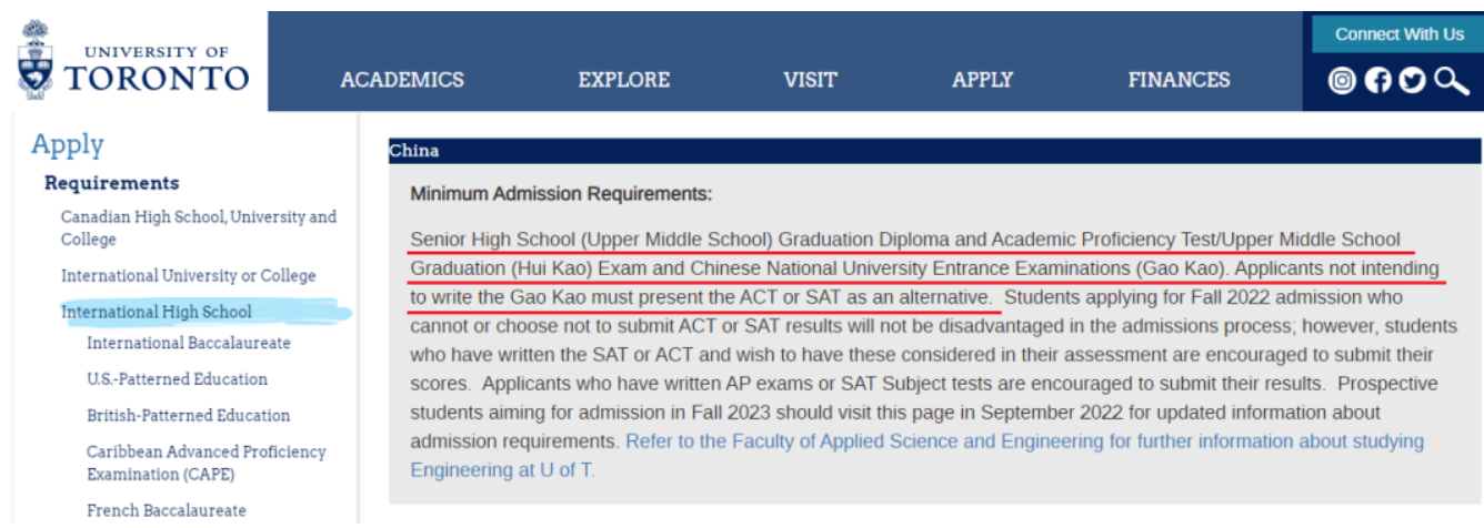 使用高考成绩申请多大,建议能达到一本以上的成绩。 如果没有完成高考,则必须参加SAT或ACT标化考试来取代高考成绩。