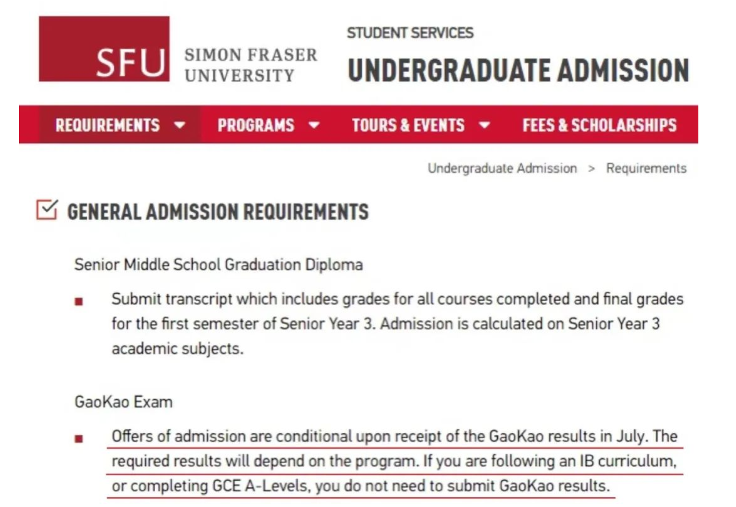 西蒙菲莎大学是要求普高申请者提供高考成绩的。但是,对于没有参加高考的申请者,也可以提供IB和A-Levels成绩。