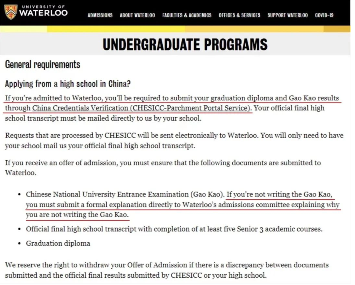 申请滑铁卢大学,需要提供学信网认证的高考成绩,以及在校成绩和毕业证书。