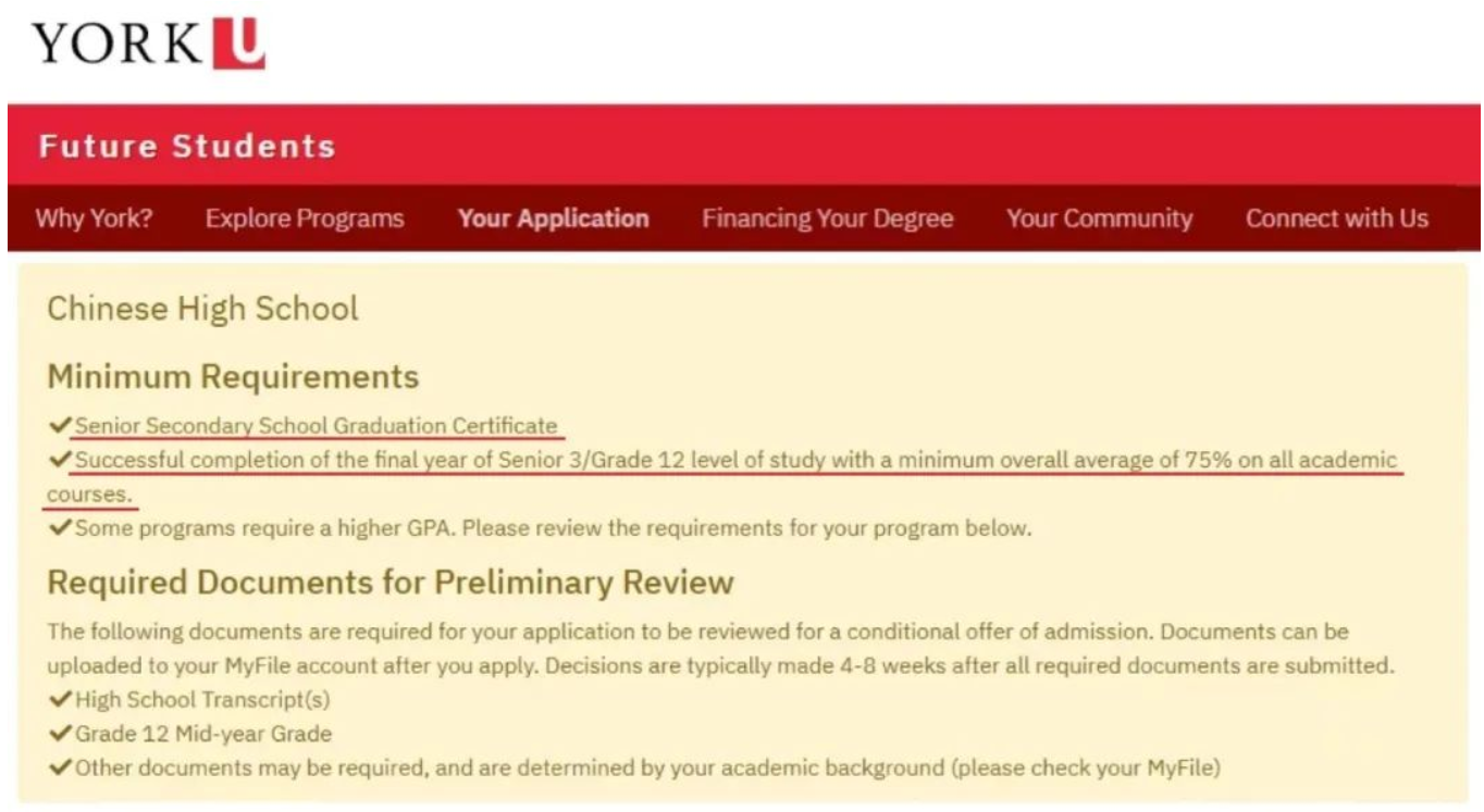 约克大学对于中国普高申请者只要求高中毕业证明和高中三年成绩。
