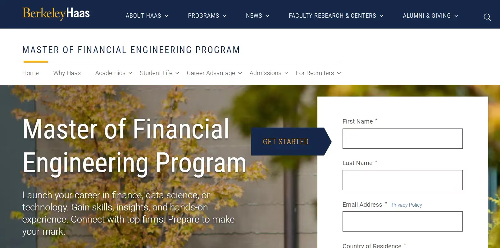 加州大学伯克利分校的Master of Financial Engineering (MFE) 开设在Haas商学院(商排 #7),项目时长1年,春季开学,该项目通过对金融、数学和计算机编程相关内容的学习满足学生在对冲基金、金融科技公司、投资银行、资产管理公司等做量化研究、建模、数据科学、资产管理、销售交易,投资组合管理,风险管理等岗位的要求。