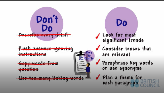 然后, 用不同的词语来阐释关键词 ,弄清问题描述的信息至关重要,对自己看到的内容进行分析, 找出图表最显著的几个趋势,对图表信息进行概括 (这是取得高分的关键步骤),概括的内容可以用在开头或者结尾,通常就是几句话。