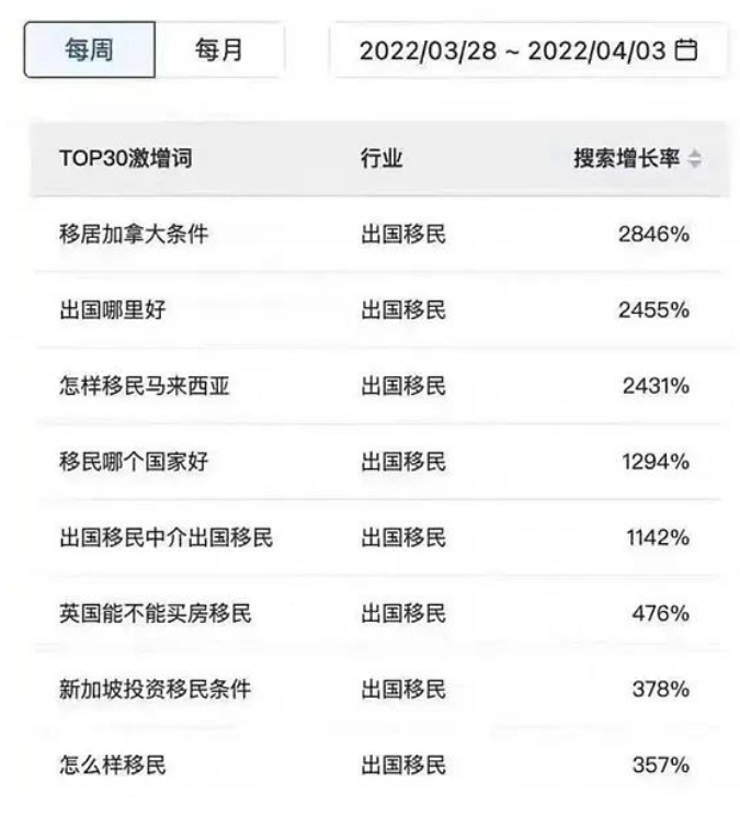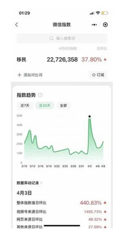 4月3日,中文关键词“移民”数据日环比暴增440%,单日搜索量达到了惊人的近5000万次——这相当于每20个微信用户中就有1个在4月3日当天搜索了“移民”事宜。