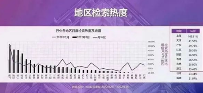 2022年2月-3月,“移民”检索量月环比增幅最高的十个地区:上海(增长109.61%)、天津(增长41.5%)、广东(增长29.79%)、江苏、陕西、香港、吉林、浙江、台湾、福建。