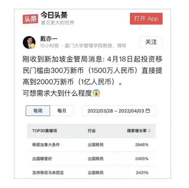 从4月18日起,新加坡投资移民门槛将从300万新币(约1500万人民币)直接跳升至2000万新币(约1亿人民币)!令人咋舌。