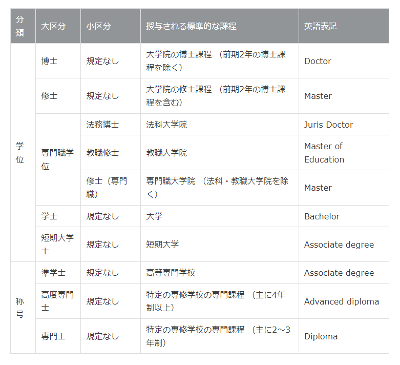 首先,基于日本的学校教育法,日本的学位只分以下几类:博士、修士、専門職学位、学士、短期大学士。其他的,比如高等专门学校毕业的称为准学士,专门学校毕业的称为专门士,这两者,只是称号,而非正式的学位。