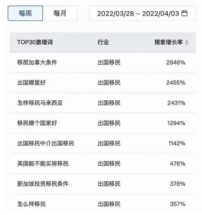 搜索热词中“移居加拿大条件”排在热搜首位,搜索增长率达2846%。紧随其后的“出国哪里好?”,增长率为2455%。