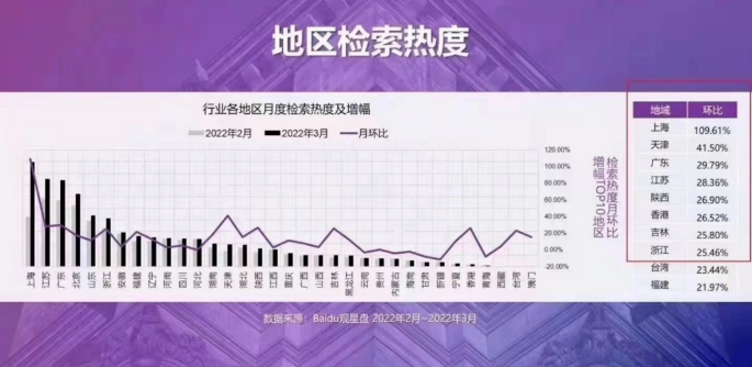检索移民热度月环比增幅TOP10的地区分别为:上海、天津、广东、江苏、陕西、香港、吉林、浙江、台湾、福建。