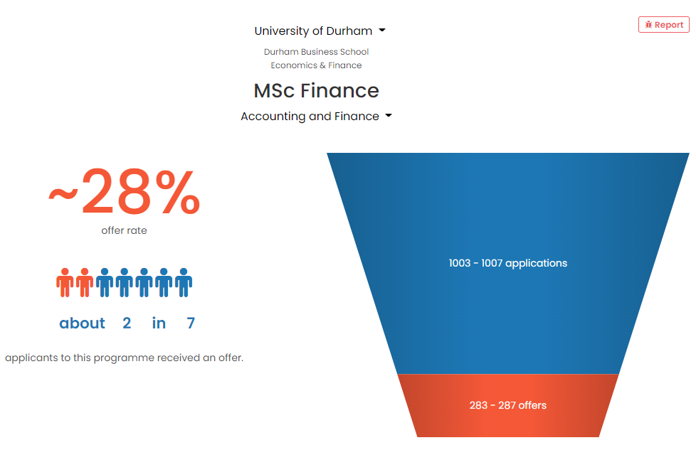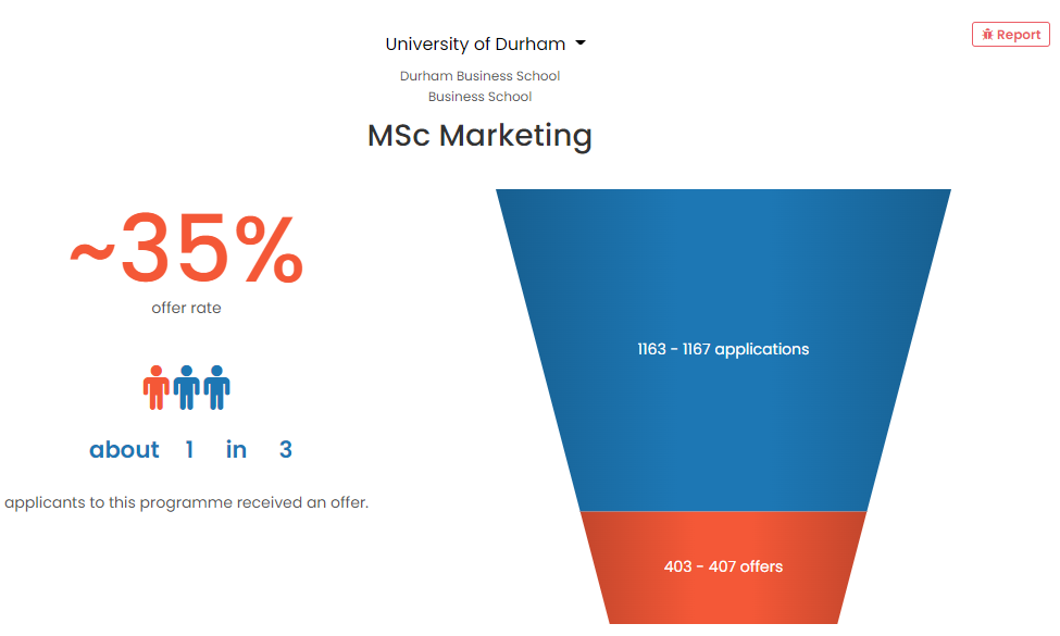 该项目是杜伦大学 申请人数最多的专业 ,有1167人申请,但只有407人收到offer, 录取率为35% ,在所有专业中也是排在中等水平,但对比其他大学的商科专业则是比较高的了。