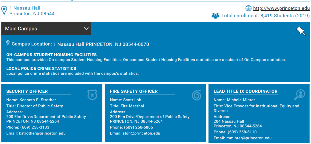 普林斯顿校园中每 10,000 人的暴力犯罪率低得惊人:仅为0.35。除了指定的校园安全办公室外,普林斯顿还提供多种举报犯罪的方式:举报热线、匿名举报热线、加密电子邮件和性虐待报告等。