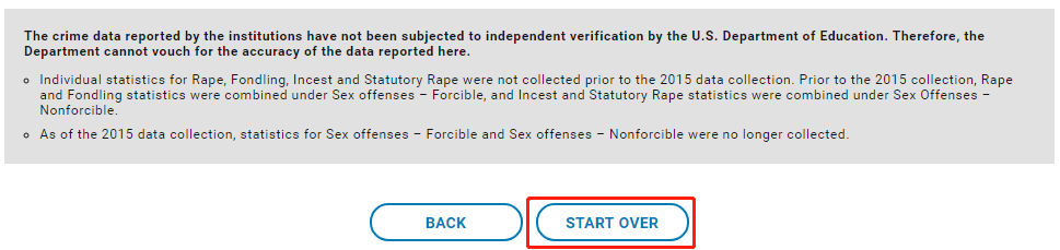 到了这里,所有的关于这个大学这个校区的安全信息就浏览完了,这个时候可以点击页面底部的Start Over,从头开始浏览别的校区的相关内容。