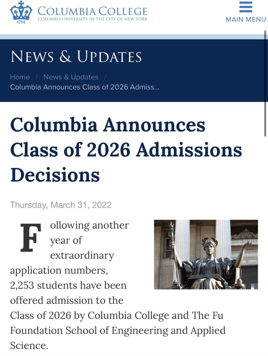 哥伦比亚大学报道指出,今年共有 60,37 份 申请,其中 2,253名 申请者被录取。 整体录取率为3.73% ,比去年3.66%略有提高。