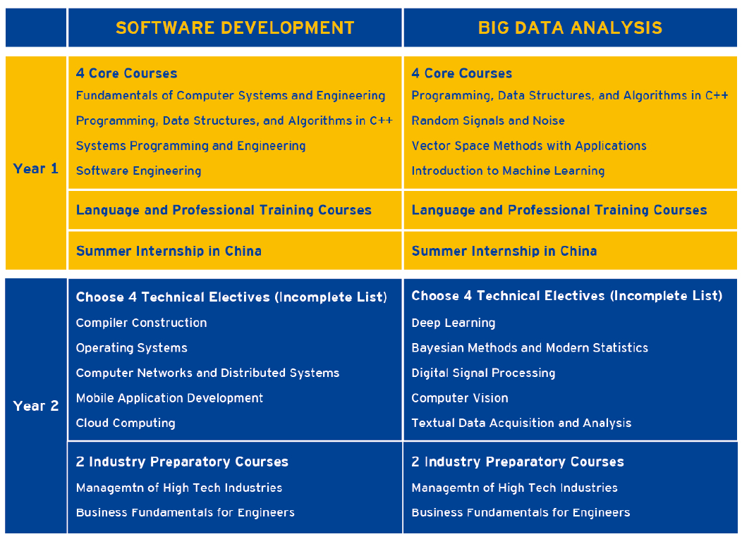 DKU ECE项目课程将会整合课堂教学及实践训练,帮助学生充分获得迎接国际化技术性挑战的能力,并积极培养学生解决问题的能力。在共计10门课程中,8门是技术性课程,2门是产业预备性课程,每门课3个学分。同时,学生将获得额外的专业性语言课程(不记学分)的训练,以提高的其语言运用能力。
