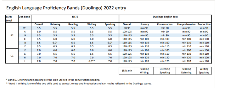 伯明翰大学2022年入学仅 线上语言班接收多邻国(Duolingo)成绩,对应要求如图 :
