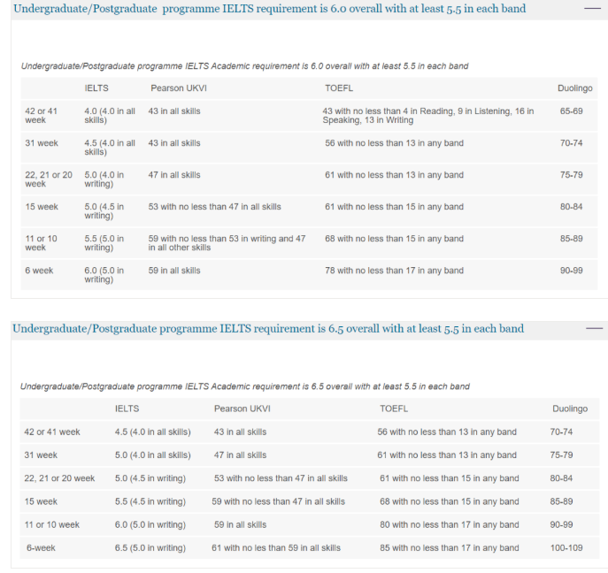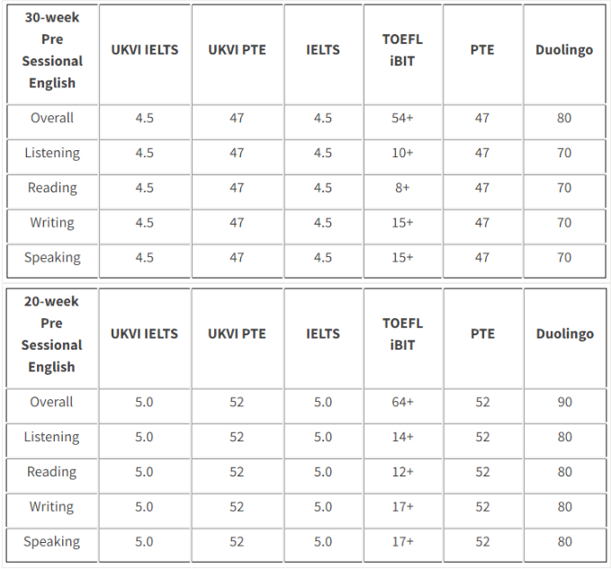 阿伯丁大学2022年入学 正课和线上语言班均接收多邻国(Duolingo)、 PTE UKVI 成绩,对应要求如图 :