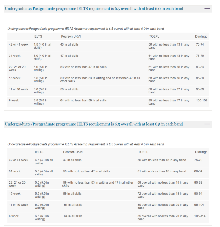 南安普顿大学2022年入学正课和线上语言班均接收多邻国(Duolingo)成绩,对应要求如图: