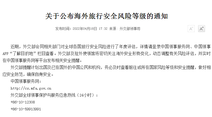 4月18日,中国领事服务网公布了有关旅行目的地国家安全风险等级评估的通知。