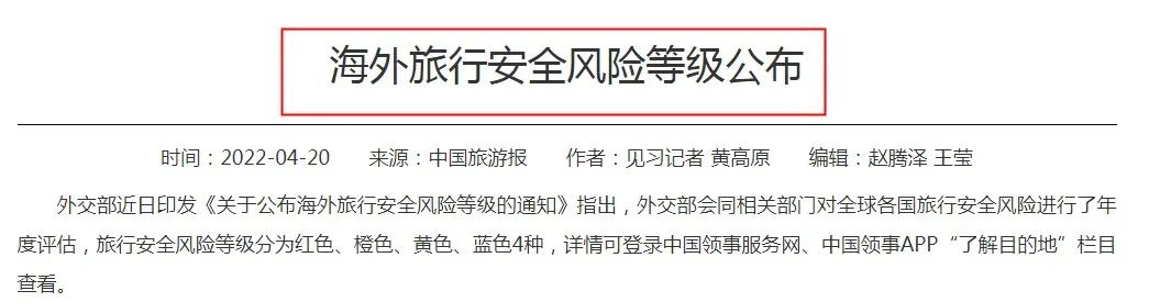 截止到2022年4月20日,中国外交部给各国的旅行风险评级如下: