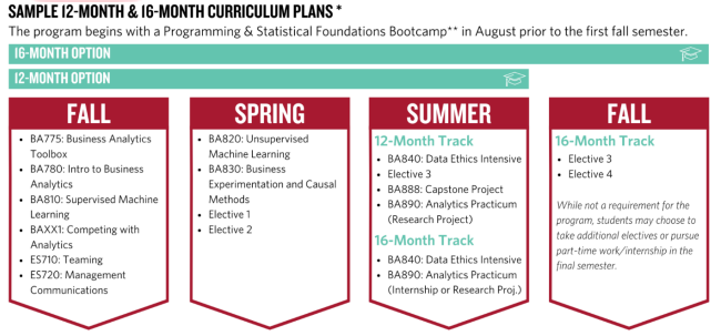 MSBA 项目重在培养学生在商业环境下批判性思考和用数据解决问题的能力。以实践为导向的课程侧重于加强学生的统计和编程能力。在第一学期,学生通过深入研究统计和编程的核心理念,在高级统计机器学期的课程中来巩固对于因果,预测,和非监督模型的理解。在接下来的学期,通过一系列的capstone 项目,将所学的理论和知识应用于不同的商业领域。此外,MSBA项目同样注重培养学生的沟通,合作能力以及领导力,帮助学生在商业环境下获得成功。