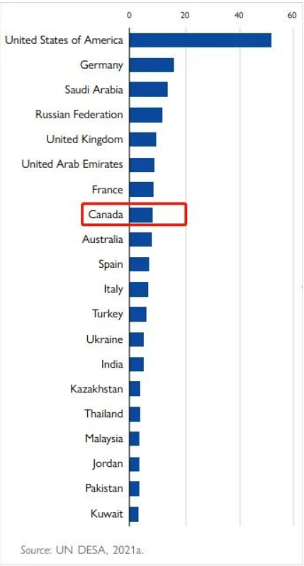 从国家来看, 美国仍是移民的主要目的国, 有5100万移民。德国是全球第二大的移民流入国,有将近1600万人。加拿大在榜单中位列第八名,略高于澳大利亚。